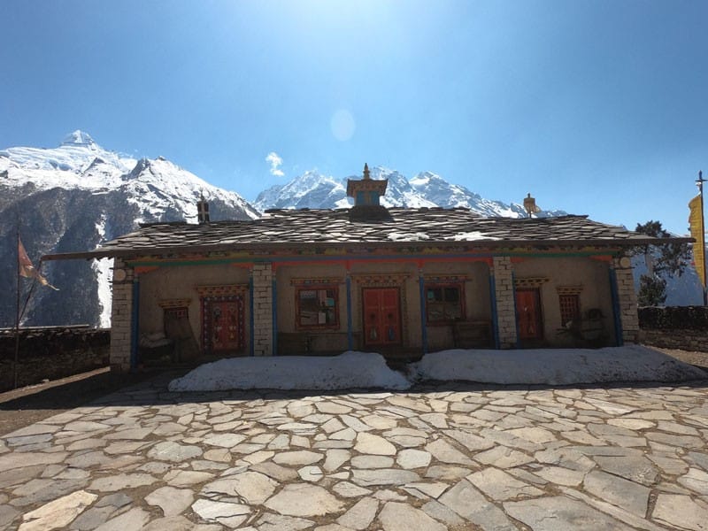 The trail now descends down to the village of Dumje, and a long, steep climb in a different valley follows. The terrain slowly turns easier but still continues to climb and only ends at Gumba Lungdang. Ganesh Himal (7422 meters) stands tall and close to the monastery, adding an edge to the already serene environment. (5 hours)