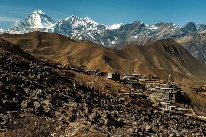 Saldang is the largest village of the inner Dolpo area. Though the village lies at about the same altitude as Ringmo, it is totally different then Ringmo, a Himalayan village is situated below the tree line, while Saldang belongs to the arid zone of the Trans-Himalayan Tibetan plateau. The village stretches for nearly two kilometers on an open slope. Saldang consists of five villages, having about eighty well-built houses with nearly six hundred people. Saldang is a prosperous village not only agriculturally but also for its strategic location on a trade route to Tibet.