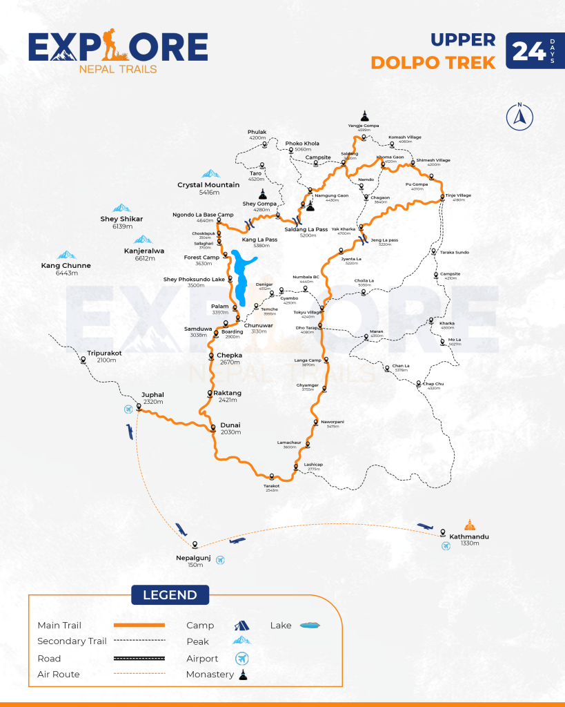 The Upper Dolpo Trek is considered moderately to highly challenging, depending on experience and fitness level. The route crosses multiple high passes above 5,000 m, requires long walking days, and often involves camping in remote regions. However, with proper acclimatization and guidance from experienced trekking crews, it’s a rewarding and safe adventure.